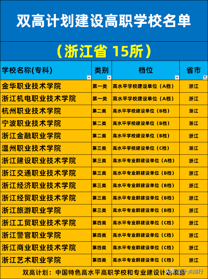 数据说明:浙江省双高计划学校名单,学校排名同档次不分先后,数据统计整理于2019年12月,十点排行制表,如有最新名单公布及调整请按官方公布为准。