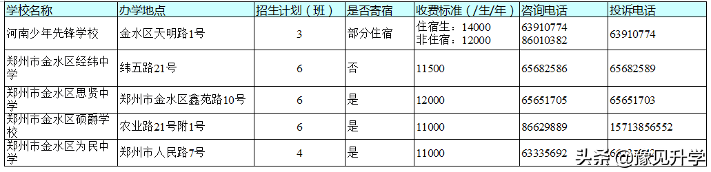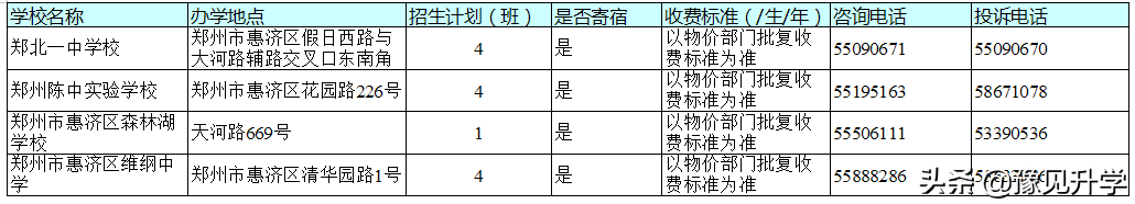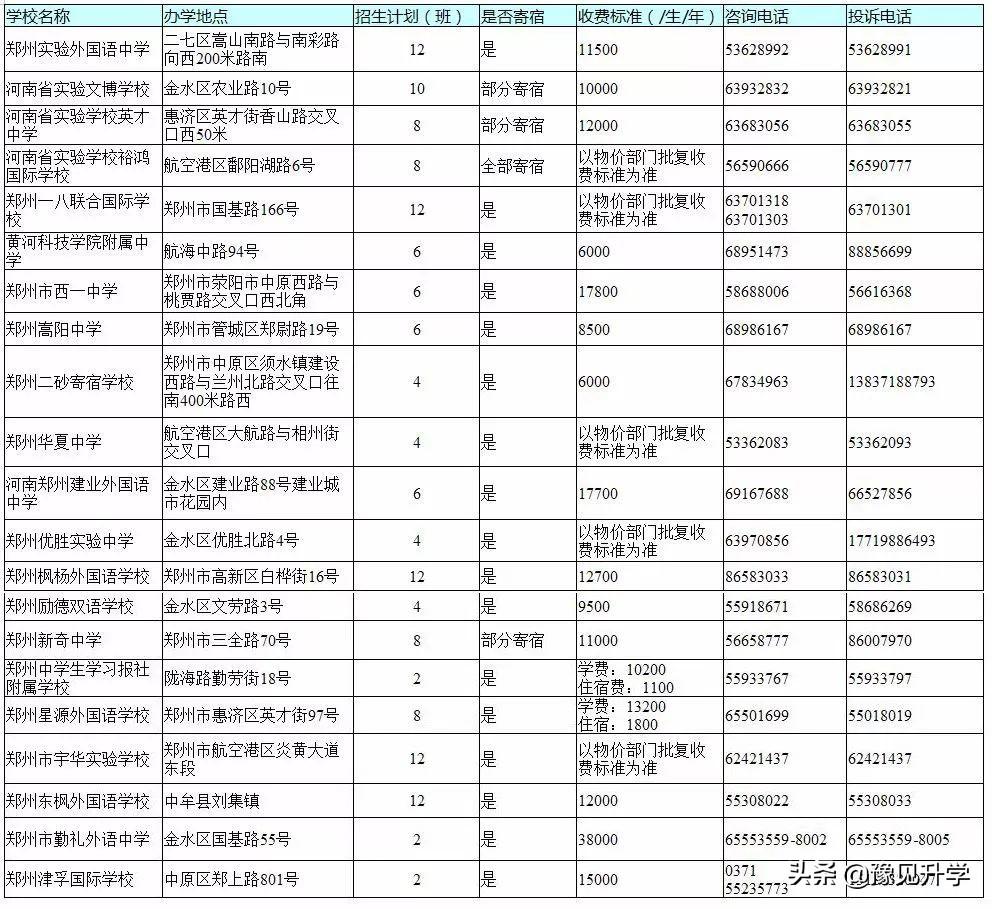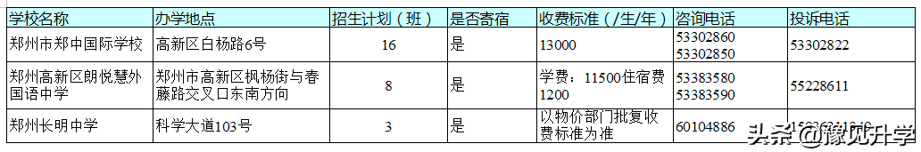 2019年郑州市市区民办初中学校招生基本信息一览表