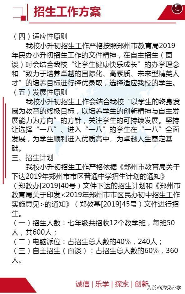 1.电脑派位:按照市教育局的相关规定,我校今年招生计划的40%为电脑派位。电脑派位工作由郑州市教育局负责统筹组织实施,电脑排位结果由市教育局于当日通过郑州教育信息网公布。我校也会于当日在网站和微信公众号公布本校电脑派位结果。
