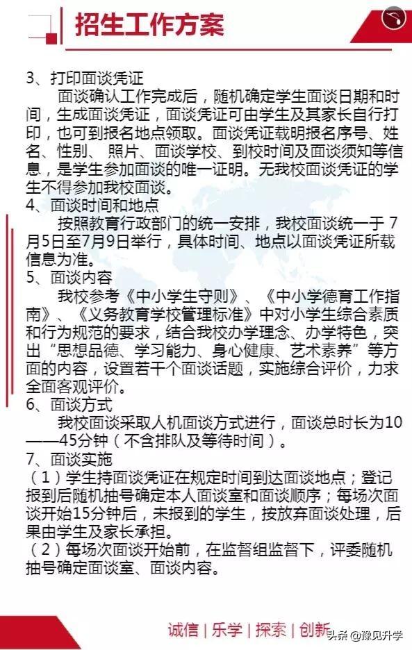 (1)面谈确认:凡已报名我校但未被电脑派位录取,且愿意参加面谈的学生,家长需于6月29日至6月30日,登录郑州市义务教育入学服务平台进行面试确认,不登录确认者,视为放弃面谈。面谈工作完成后,系统随机确定面谈日期和时间,生成面谈凭证,面谈凭证可由学生及家长自行打印,也可到报名地点领取。面谈凭证是学生参加面谈的唯一证明。无我校面谈凭证的学生不得参加面谈。面谈凭证载明编号、姓名、性别、照片、面谈学校、到校时间、面谈时间及面谈须知。
