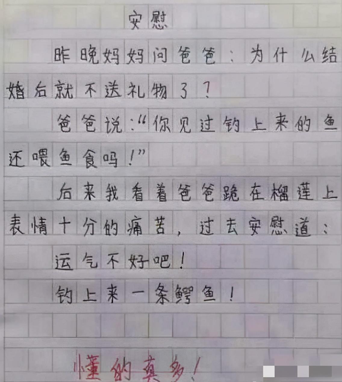 除了以上两个未来的相声大师,还有这个孩子,也是把自己父母的相处情况给描写了出来,而且全文非常有趣。他说的是自己爸爸求生欲不强,把心里话说出来的情况,结果当即就被罚跪在榴莲上,估计这个爸爸没少挨自己巴掌,骂自己多嘴。