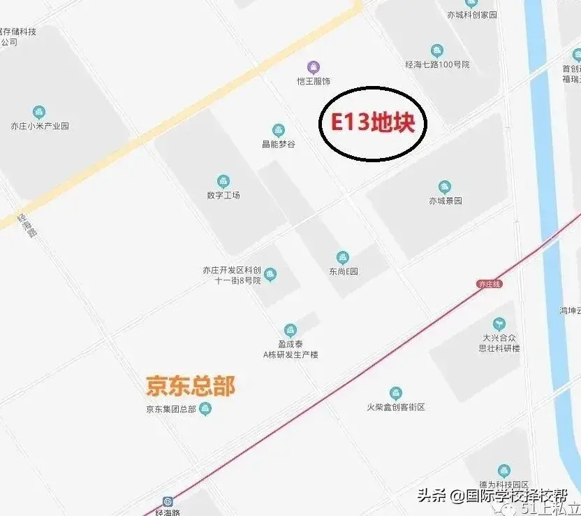 此次“官宣”的E13地块,E13地块位于亦庄的亦城景园西北侧,距离亦庄线经海路站和京东集团总部很近。