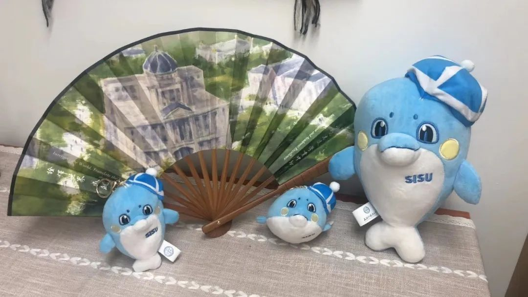 首先登场的是上外特色折扇,打开木质折扇,一面印有校友亲笔绘制的图文信息中心全景,另一面则是上外校徽与校名,展现了上外校园的独特气质;第二个礼物则是新晋顶流、上外吉祥物——特稳豚,头戴图文圆顶、颜值与实力并存的Twenie带领着学子们开启乘风破浪的上外之旅!