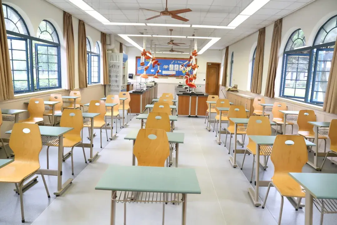 每个学科一个教室,保障走班制教学的开展,包括经济教室、物理教室、生物教室、音乐教室、艺术教室、数学教室、钢琴房等等。