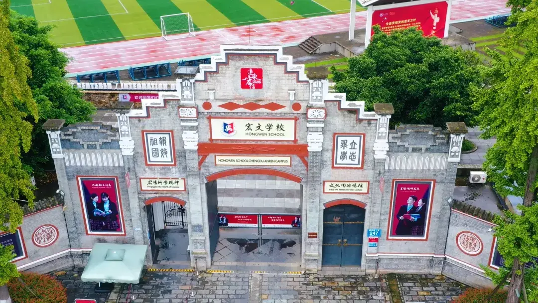 宏文的前身是中国西南名校文彩中学。1945年,刘文彩聘请德国专家设计,投资200万美金捐建,坐落在川西风水宝地,有着1300余年历史的安仁古镇。