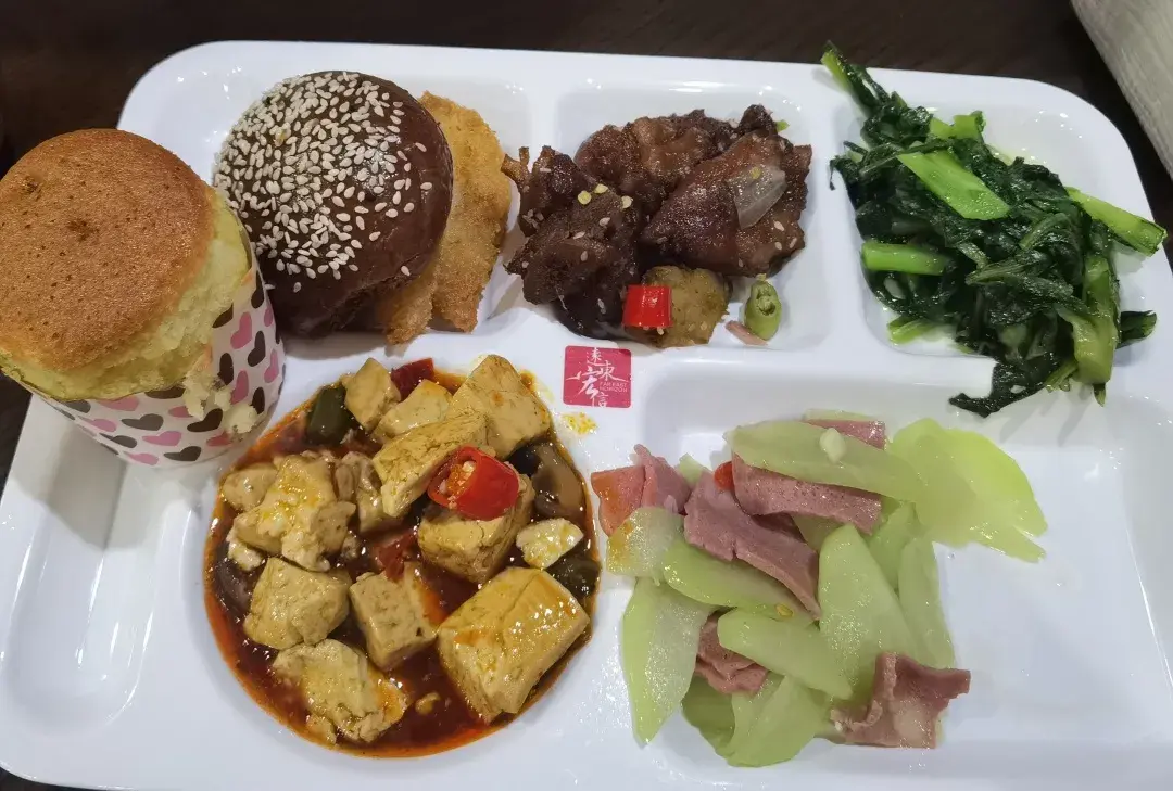 肉菜包括鸡鸭鱼牛羊。除此之外,还会提供荤素两种类型的汤,及1至2种水果和点心,点心包括蛋挞、三明治、包子、煎饺等等。
