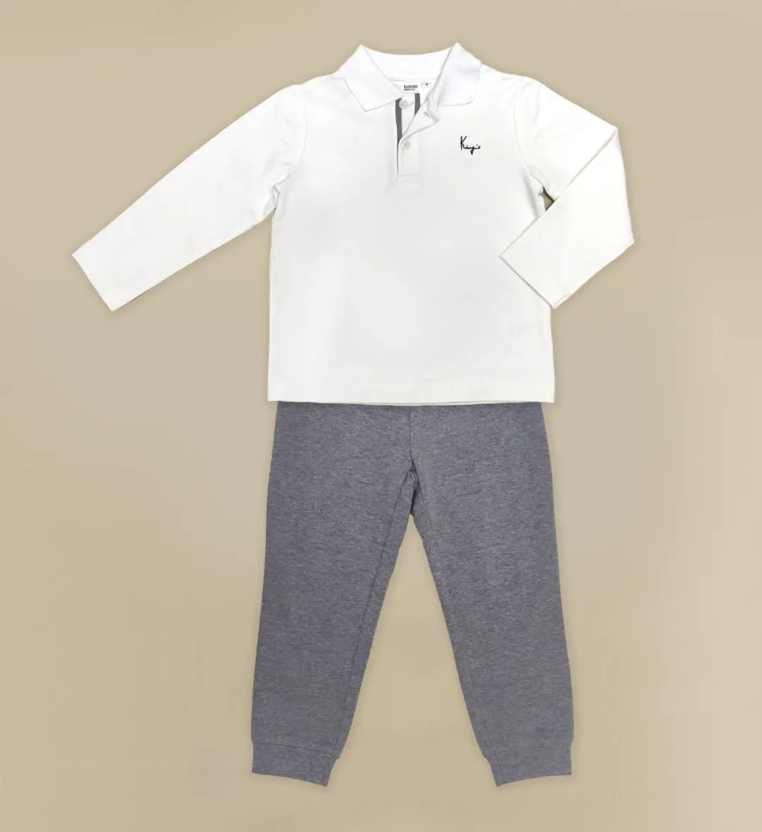 冬天的运动服设计也同样细心,男生是白恤衫加灰色运动裤,白恤衫的领口内部两边藏着两抹灰,与裤子的灰遥相呼应,裤脚处做了束腿处理,方便孩子奔跑玩耍。