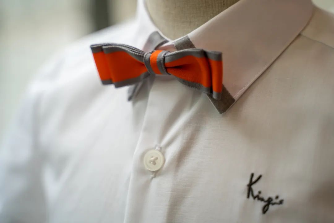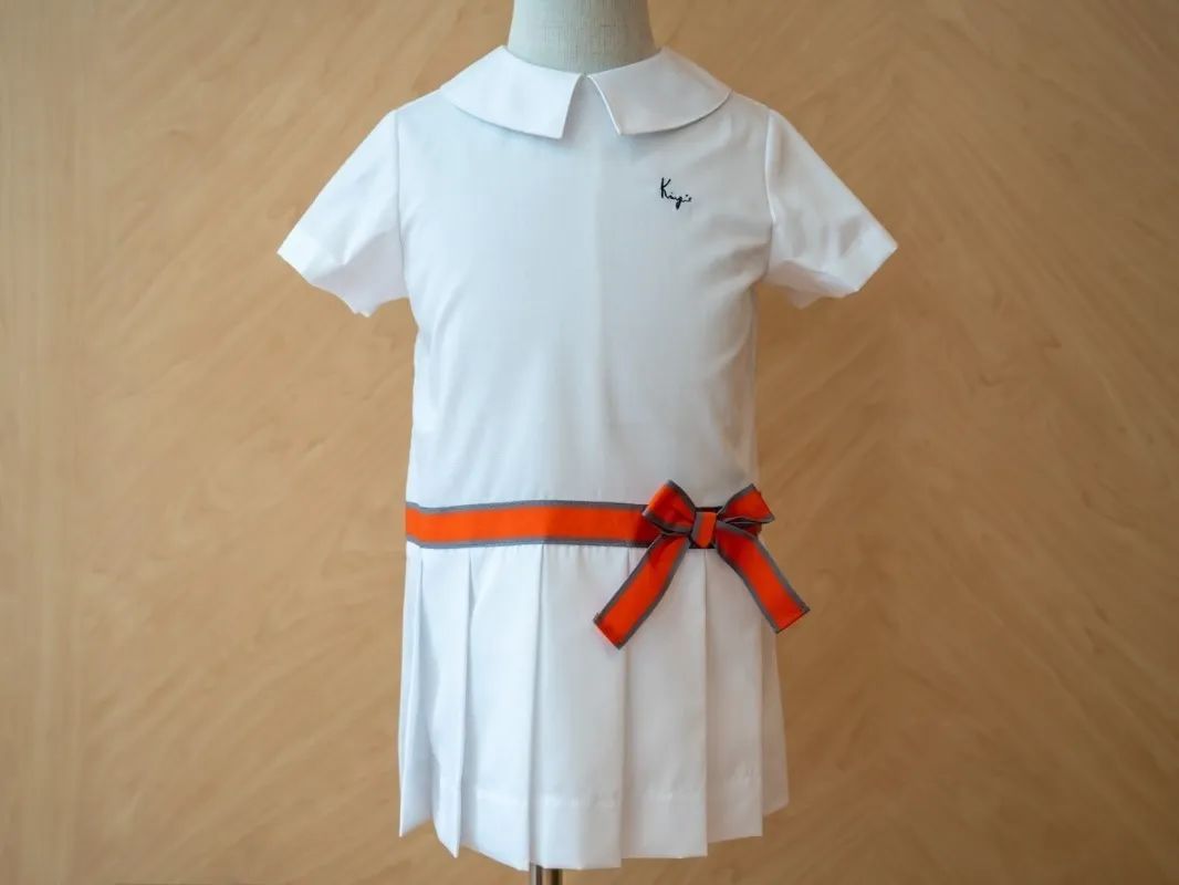 男生的夏季礼服由一件白色的衬衫、灰色短裤和橙灰相间的领结组成。