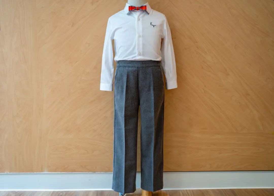 白色衬衫领口处,两抹灰色让礼服更显得端庄,左胸口标志性的King's给孩子一份心理上的归属感,是金生学习者社区成员的标志。