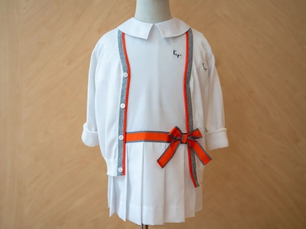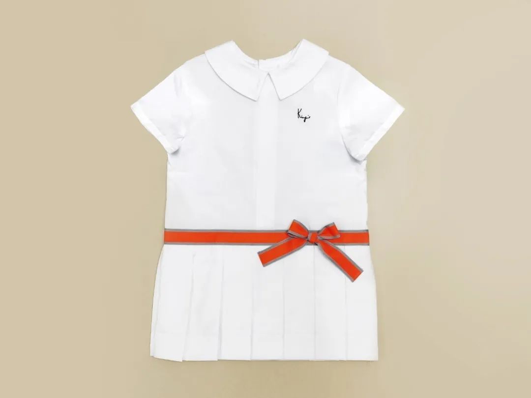 女生的夏季礼服是一条简单的白色裙子。领口设计与男生不同,我们把有弧度的圆领送给女孩,橙灰色蝴蝶结放在腰部,让礼服整体看上去恬静、温柔。