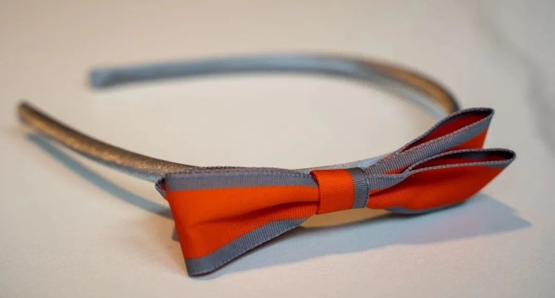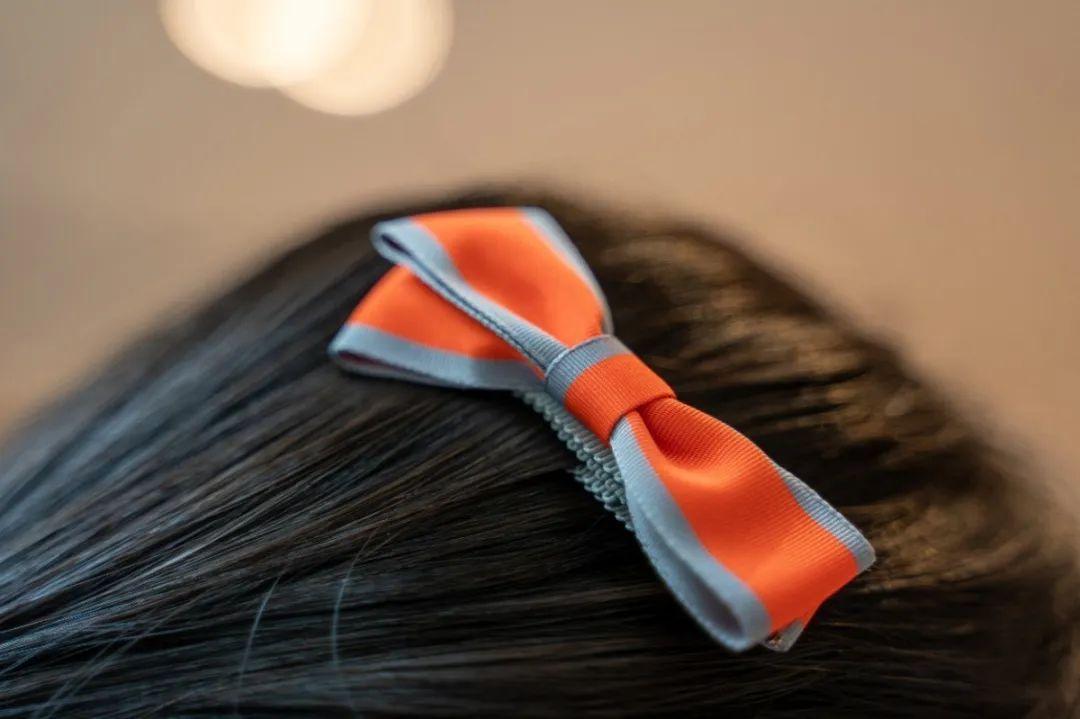 我们还特意为女生设计了发饰,包括发箍、头绳和发荚。发饰的设计与领结一致,橙灰相间,可搭礼服与运动服。
