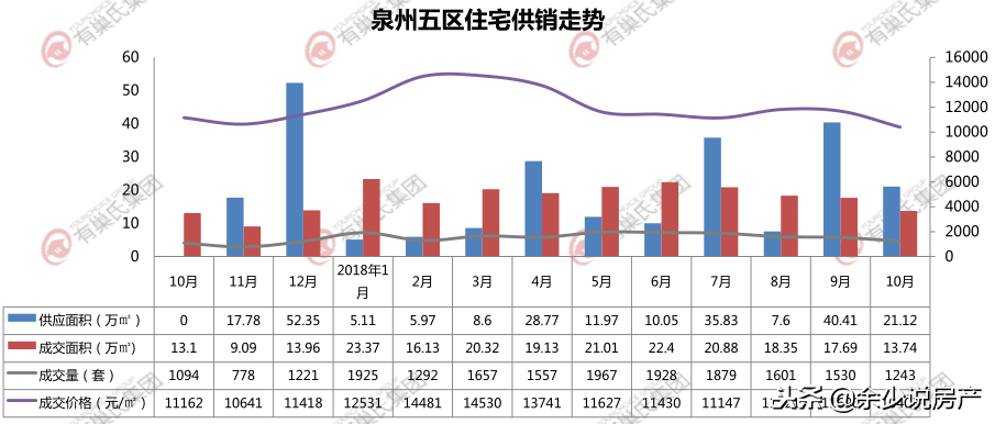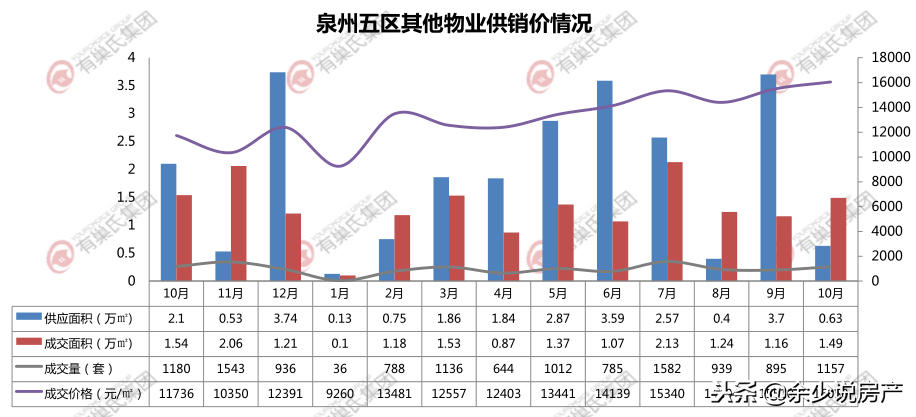 供应面积:本月泉州五区其他物业新增供应0.63万㎡,去年同期新增供应2.10万㎡;