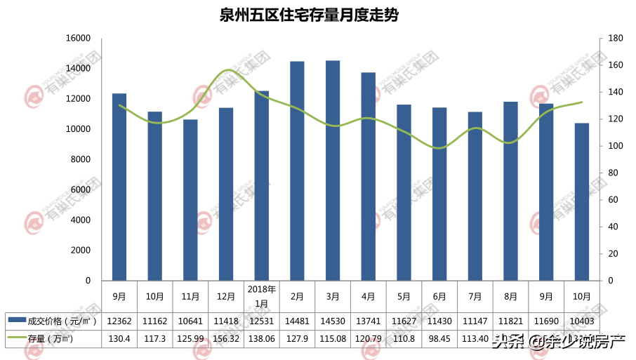 泉州五区住宅存量132.64万㎡,月均去化18.01万㎡,当月去化周期为7.4个月。