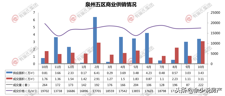 供应面积:本月泉州五区商业新增供应3.43万㎡,去年同期新增供应0.81万㎡;