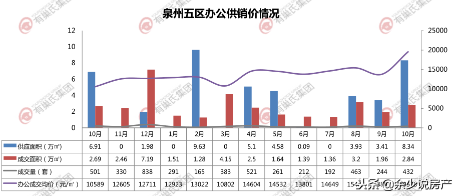 供应面积:本月泉州五区办公新增供应8.34万㎡,去年同期新增供应6.91万㎡;