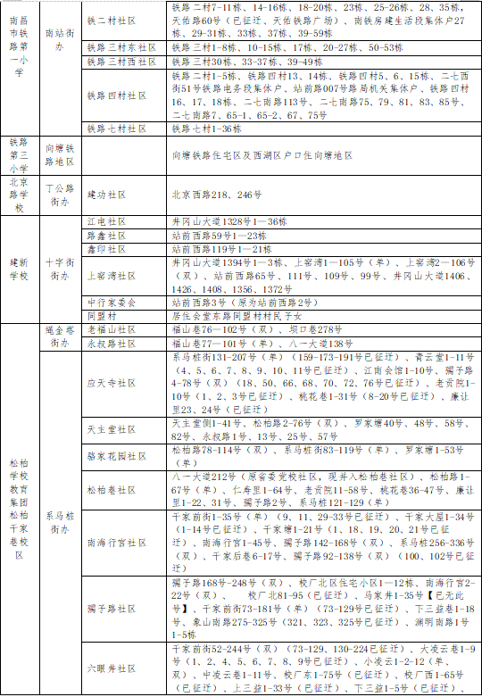 3.沪昆铁路线以南至抚州大街以北,枫生高速以东至婺源路以西合围区;龙兴大街以南至上饶大街以北,九龙大道以东至赣江南大道以西合围区;龙兴大街以南至抚州大街以北,杨岐山大道以东至枫生高速以西合围区;青花九龙、九龙阳光、天集西站明珠、江语院、联发万科西岸春风在红谷滩区腾龙学校暂时过渡就读。
