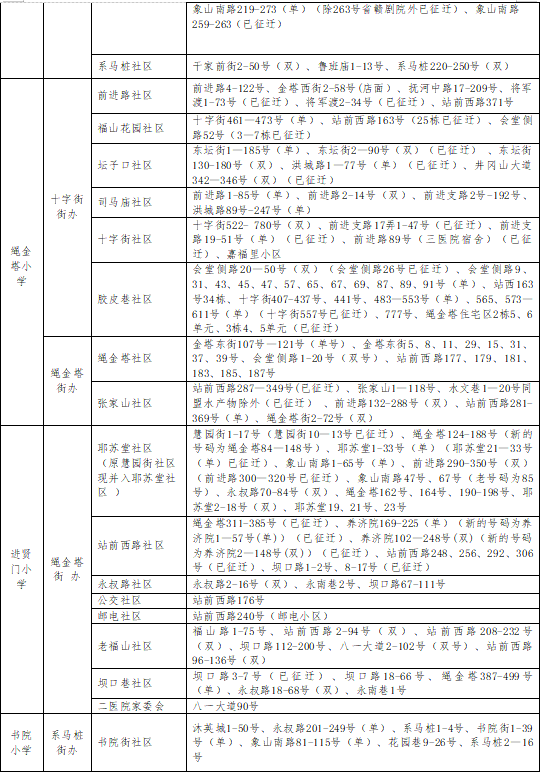 叠山路:单号211#—533#(苏圃路至胜利路段),双号398#—468#(象山北路至胜利路段);象山北路:单号245#—391#,双号274#—392#(叠山路至阳明路段);阳明路:双号122#—190#(象山北路至苏圃路段);苏圃路:双号(叠山路至阳明路段);张家厂;环湖路:单号105#—197#,双号2#—56#(叠山路至阳明路段);沙坝巷、德内谌家巷、墩子塘巷、青莲庵巷、右营街、马家池街、箭道巷、包家巷、桂旺巷、梧桐巷。