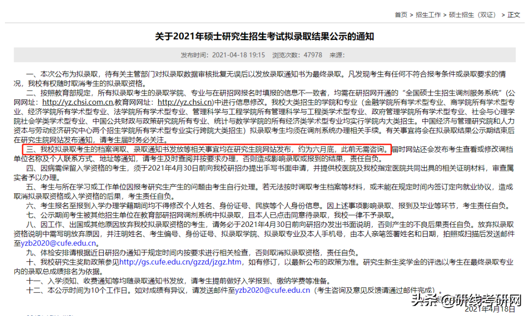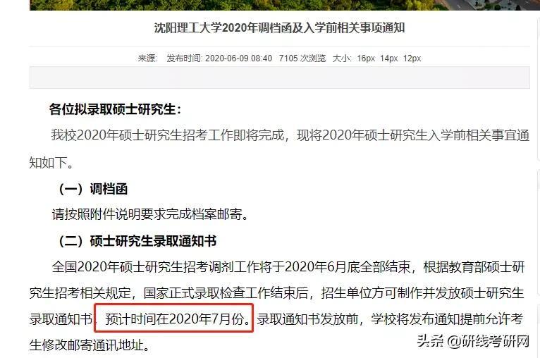 “我校拟录取考生的档案调取、录取通知书发放等相关事宜均在研究生院网站发布,约为六月底,此前无需咨询。届时网站还会发布考生查看或修改调档单位名称及个人联系方式、地址等通知,请考生及时查阅并按要求办理,否则造成影响录取或报到的结果,责任自负。”