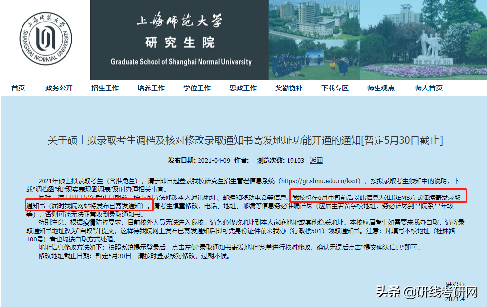 “我校硕士研究生录取通知书预计于6月中下旬寄发,寄发之前,请考生登录我校硕士招生平台中“核实录取通知书邮寄信息”模块(4月15日开通)填写接收录取通知书的通信地址及联系方式,信息填写时间为2021年4月15日9:00-5月30日16:00。逾期不予修改。”