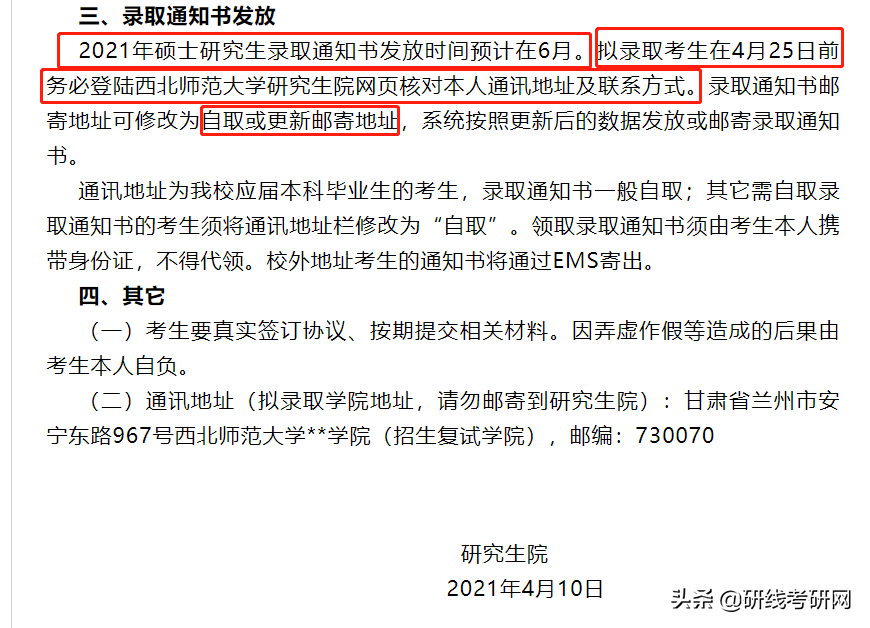 “2021年硕士研究生录取通知书发放时间预计在6月。拟录取考生在4月25日前务必登陆西北师范大学研究生院网页核对本人通讯地址及联系方式。录取通知书邮寄地址可修改为自取或更新邮寄地址,系统按照更新后的数据发放或邮寄录取通知书。”