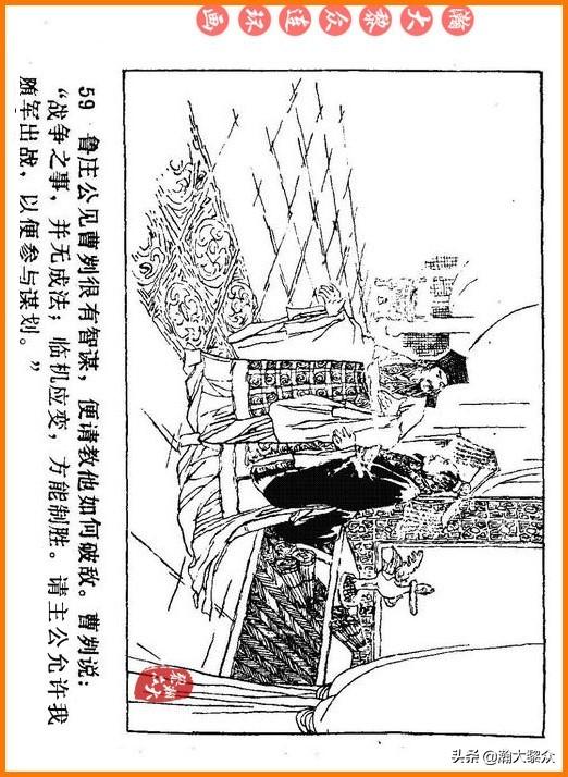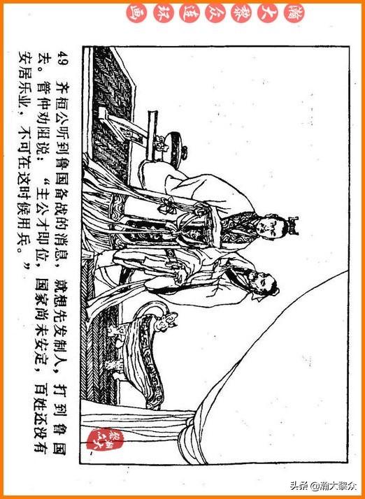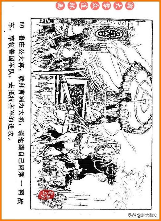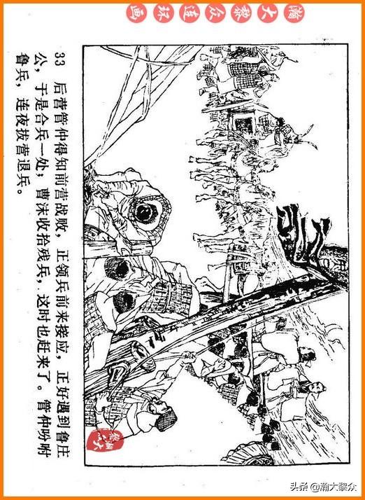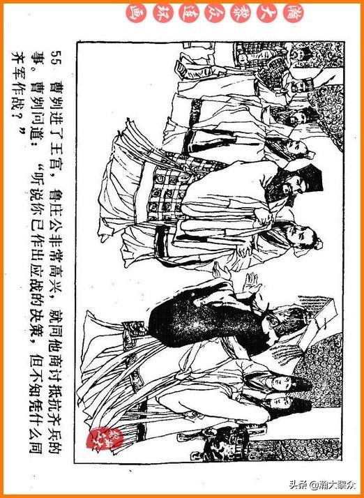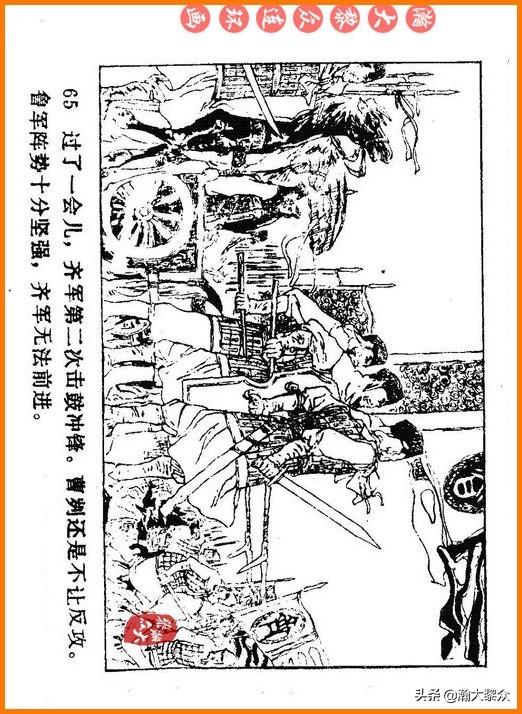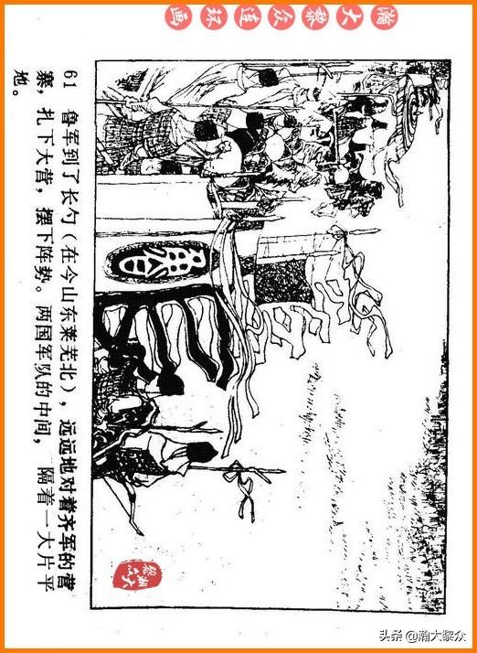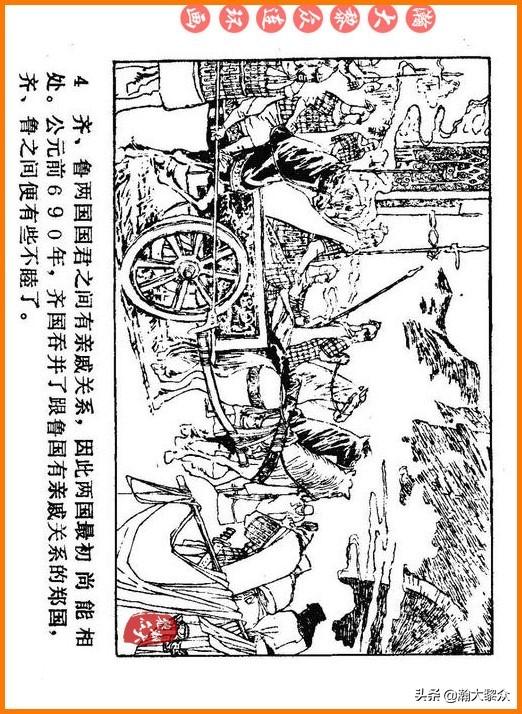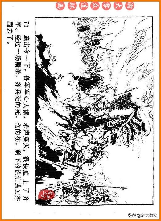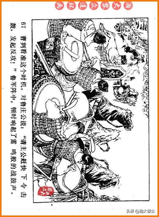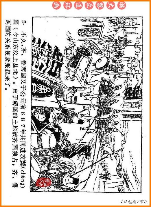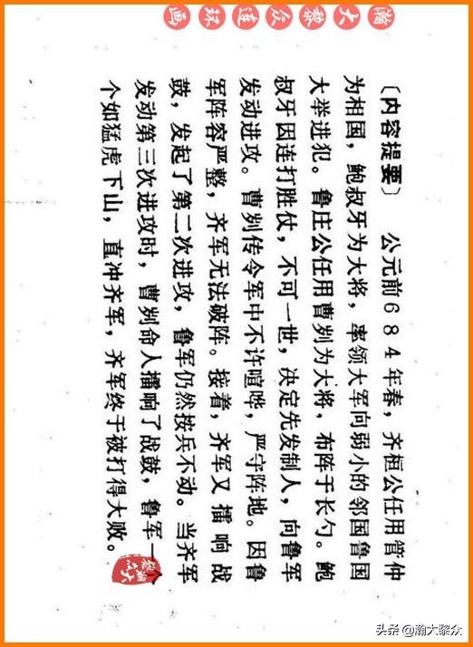 【内容提要】公元前684年春,齐桓公任用管仲为相国,鲍叔牙为大将,率领大军向弱小的邻国鲁国大举进犯。鲁庄公任用曹刿为大将,布阵于长勺。飽叔牙因连打胜仗,不可一世,决定先发制人,向鲁军发动进攻。曹刿传令军中不许喧哗,严守阵地。因鲁军阵容严整,齐军无法破阵。接着,齐军又擂响战鼓,发起了第二次进攻,鲁军仍然按兵不动。当齐军发动第三次进攻时,曹岁命人播响了战鼓,鲁军一个个如猛虎下山,直冲齐军,齐军终于被打得大败。