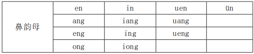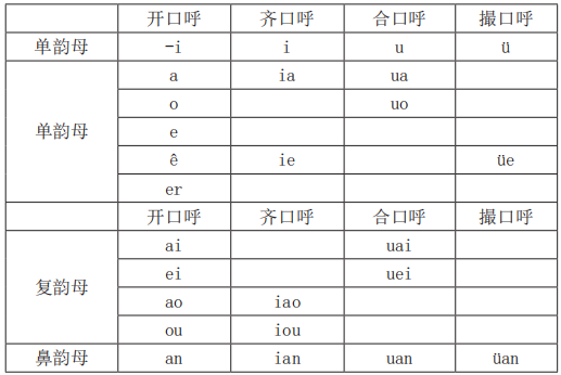 普通话韵母共有三十九个,按结构可以分为单韵母、复韵母、鼻韵母;按开头元音发音口形可分为开口呼、齐齿呼、合口呼、撮口呼,简称"四呼"。