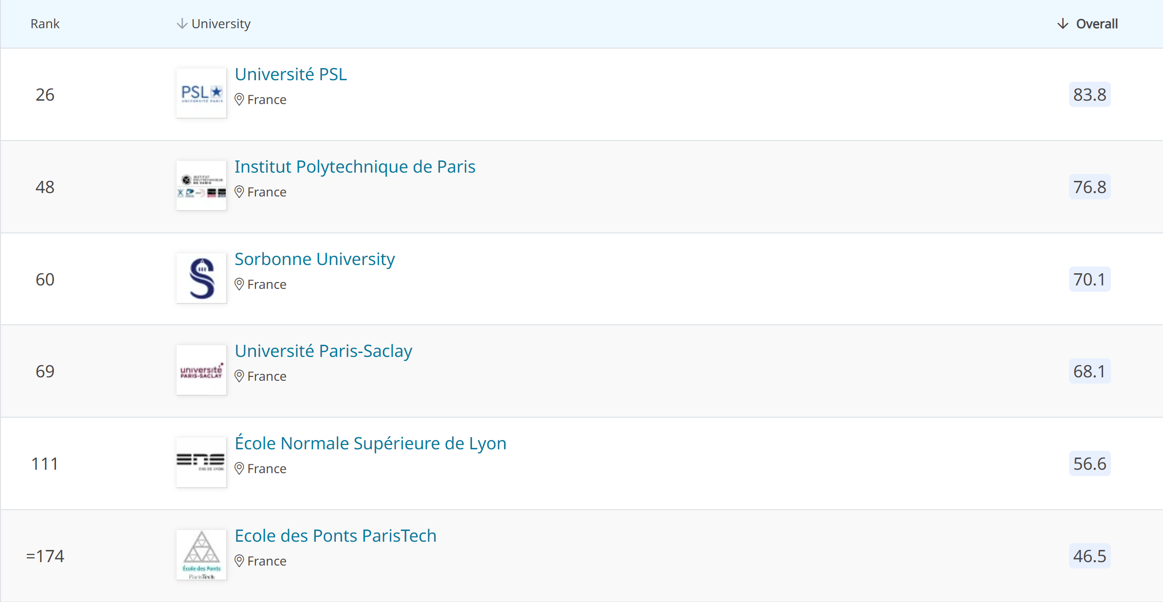榜单前50名中,欧洲高等商学院(ESCP)排名第14、法国里昂商学院排名第19、法国南特高等商学院从第45名跃升到第31名、格勒诺布尔高等商学院排名第36、法国凯致商学院排名第40、诺欧商学院排名第44、Skema商学院排名第48。