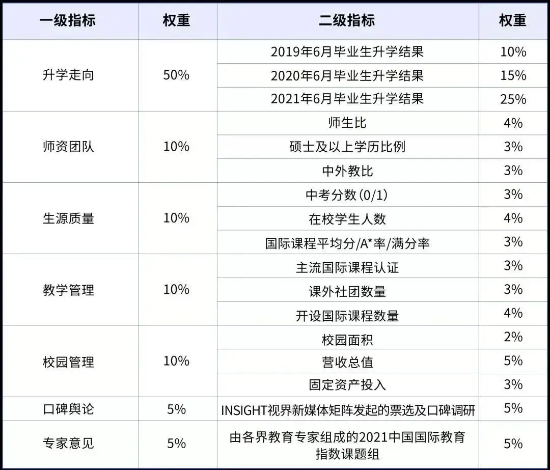 除了升学走向之外,师资团队(10%)、生源质量(10%)、教学管理(10%)、校园管理(10%)、口碑舆论(5%)、专家意见(5%)也被纳入考量。