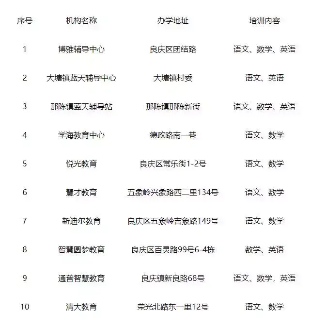 良庆区第一批校外培训机构白名单: