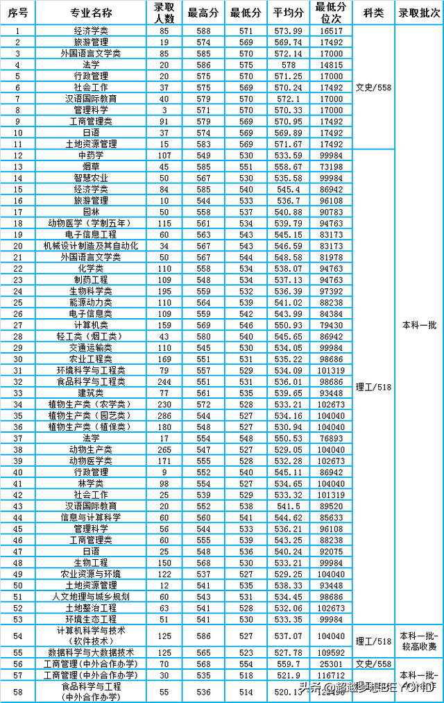本科一批理工类专业(不含高收费、中外合作办学)录取最高分585分(烟草、经济学类),录取最低分527分(超过一本线9分),最低分位次104040,详见下表。