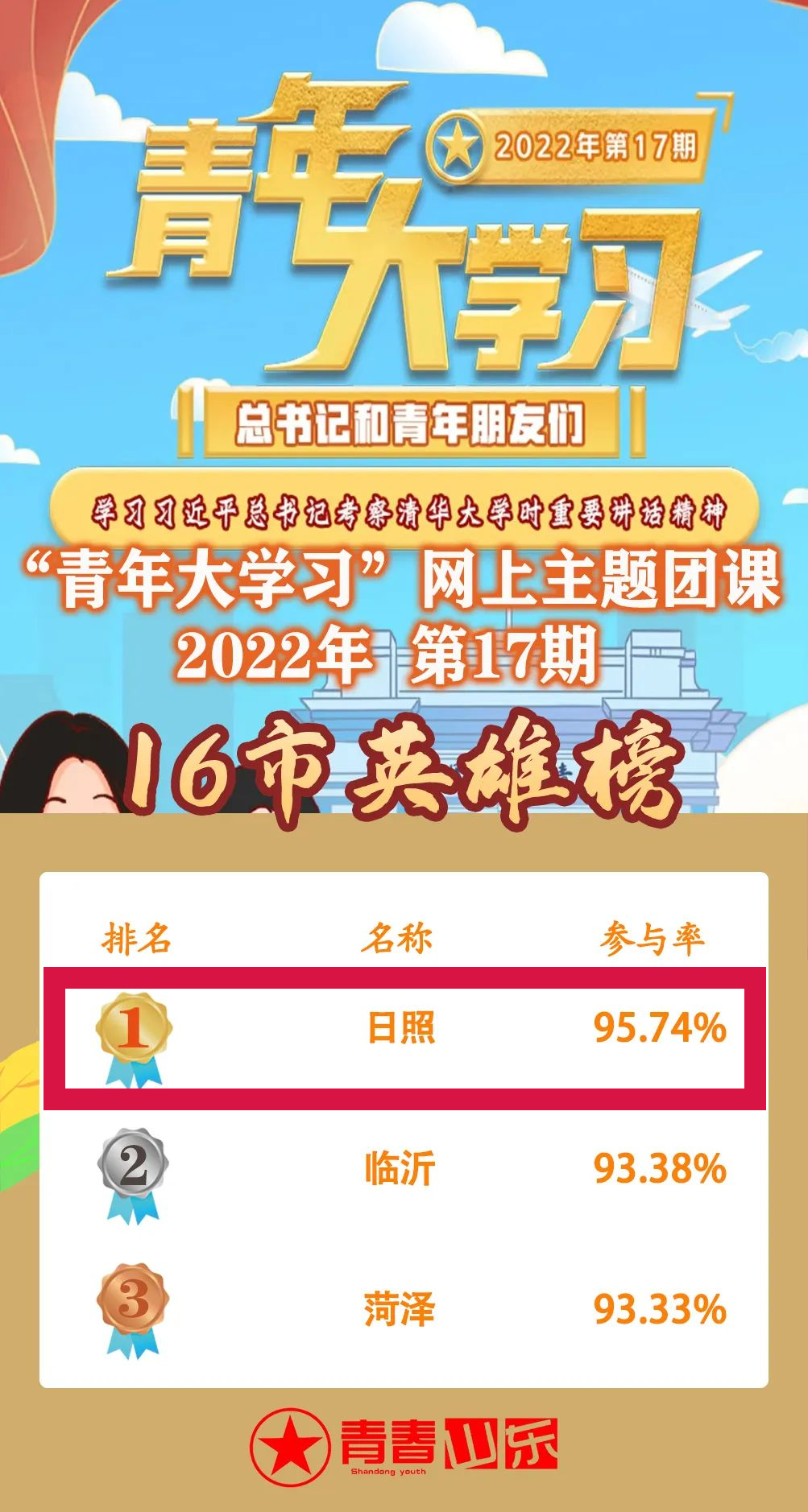“青年大学习”2022年第17期中,日照创业青年团工委以340.00%的参学率在市企业团组织中独占鳌头,日照钢铁、锦华集团分别位列第二、第三。