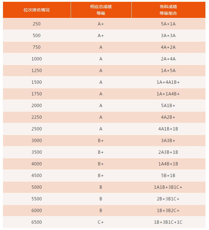 中考考生书面考试各科成绩及总成绩均划分为八个等级,从高到低依次为A+、A、B+、B、C+、C、D、E。各学科等级及总成绩等级所占比例为:A+等级7%,A等级20%,B+等级20%,B等级15%,C+等级15%,C等级10%,D等级10%,E等级3%。体育与健康考试成绩不划分等级,直接计入考生的总成绩后一并转换为总成绩等级。中考成绩仅通知考生本人和所在学校,不公布和透露考生中考原始分数,不以任何形式公布名次和按考试成绩给学校、学生排队。