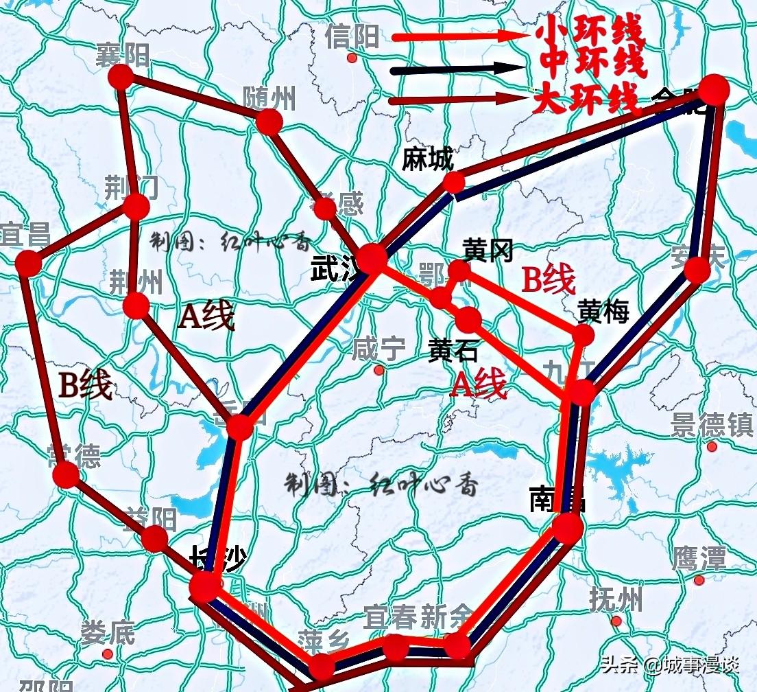 长江中游城市群小环线高铁将分别由武汉、长沙和南昌发出,高铁的起点和终点均为同一个中心城市。长江中游城市群小环线高铁具体将经过武汉、咸宁、岳阳、长沙、株洲、萍乡、宜春、新余、南昌、九江、黄石、鄂州等地至武汉。这里需要说明一下,长江中游城市群小环线高铁武汉至九江段将分为A线和B线(有些车将走A线,有些车则会走B线),A线为武汉、鄂州、黄石至九江,B线则是武汉、鄂州、黄冈至九江。