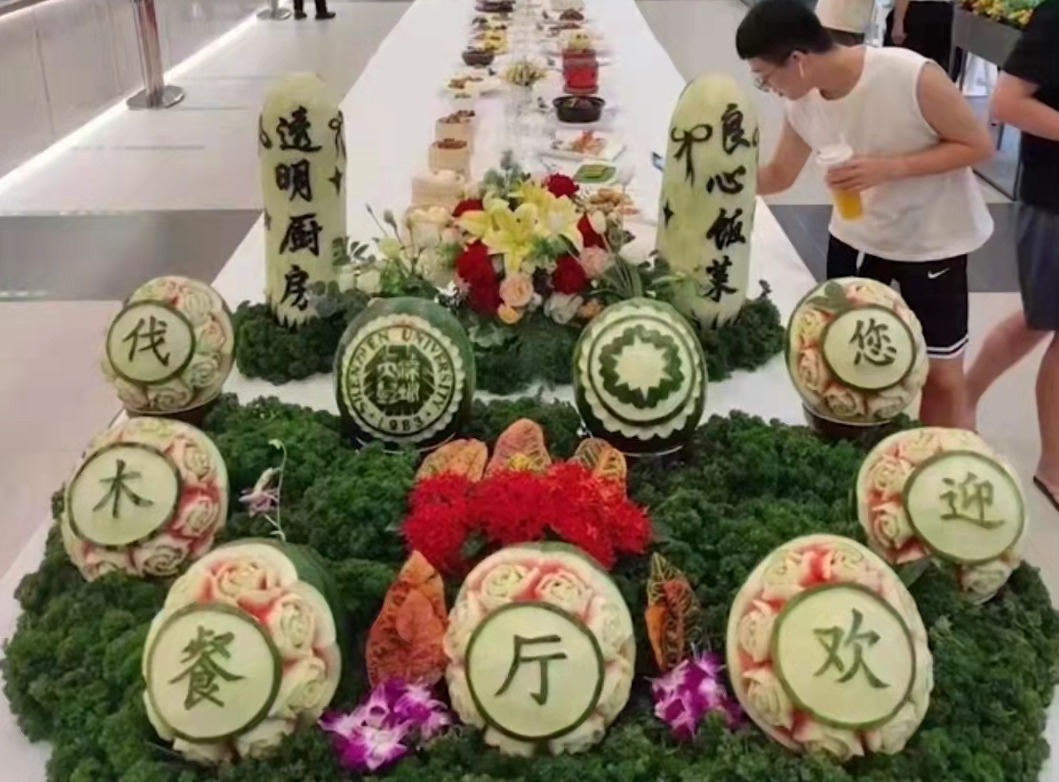 比如随便给来个雕刻就很漂亮,21年的时候有学校大厨为了迎接新生的到来,在学校食堂的门口放了满满的食材雕刻,能看出精湛的手法,和不一样的审美风格。