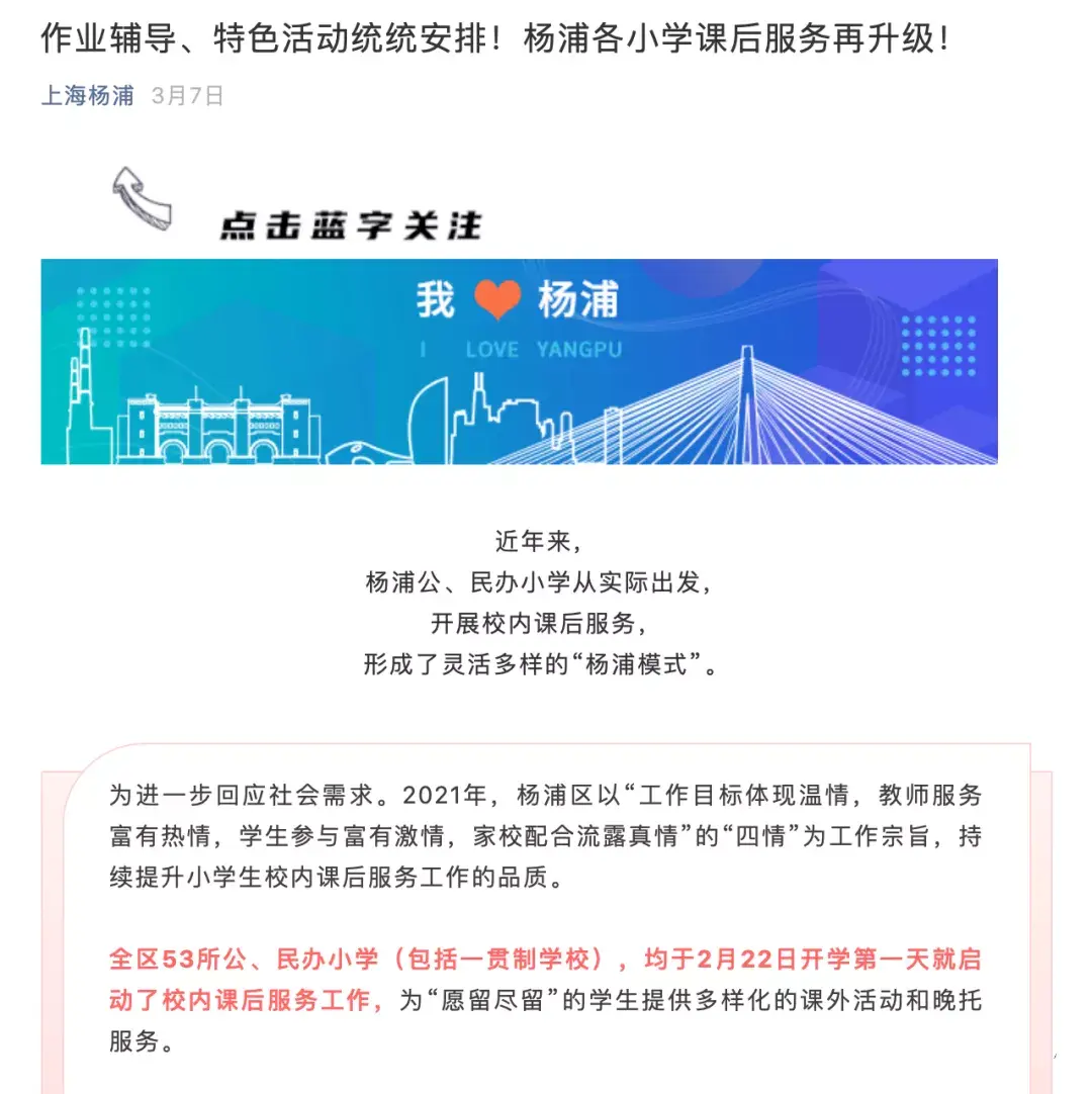 为进一步回应社会需求,2021年杨浦区以“四情”为工作宗旨,全力推进小学生校内课后服务工作的开展,持续提升小学生校内课后服务工作的品质。