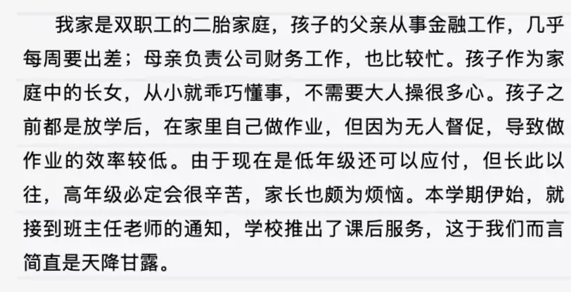 这一服务开展以后,得到了大量家长的称赞,一位家长还写信感谢学校的帮助~可以看出这个课后服务对双职工家庭有多便利!