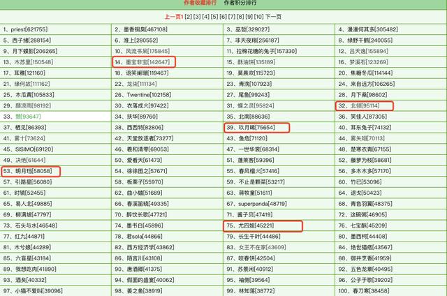 成绩最好的墨宝非宝,也不过才排名14,至于其他的言情作家,能够挤进前百的,也就只有上面提到的这几位了。