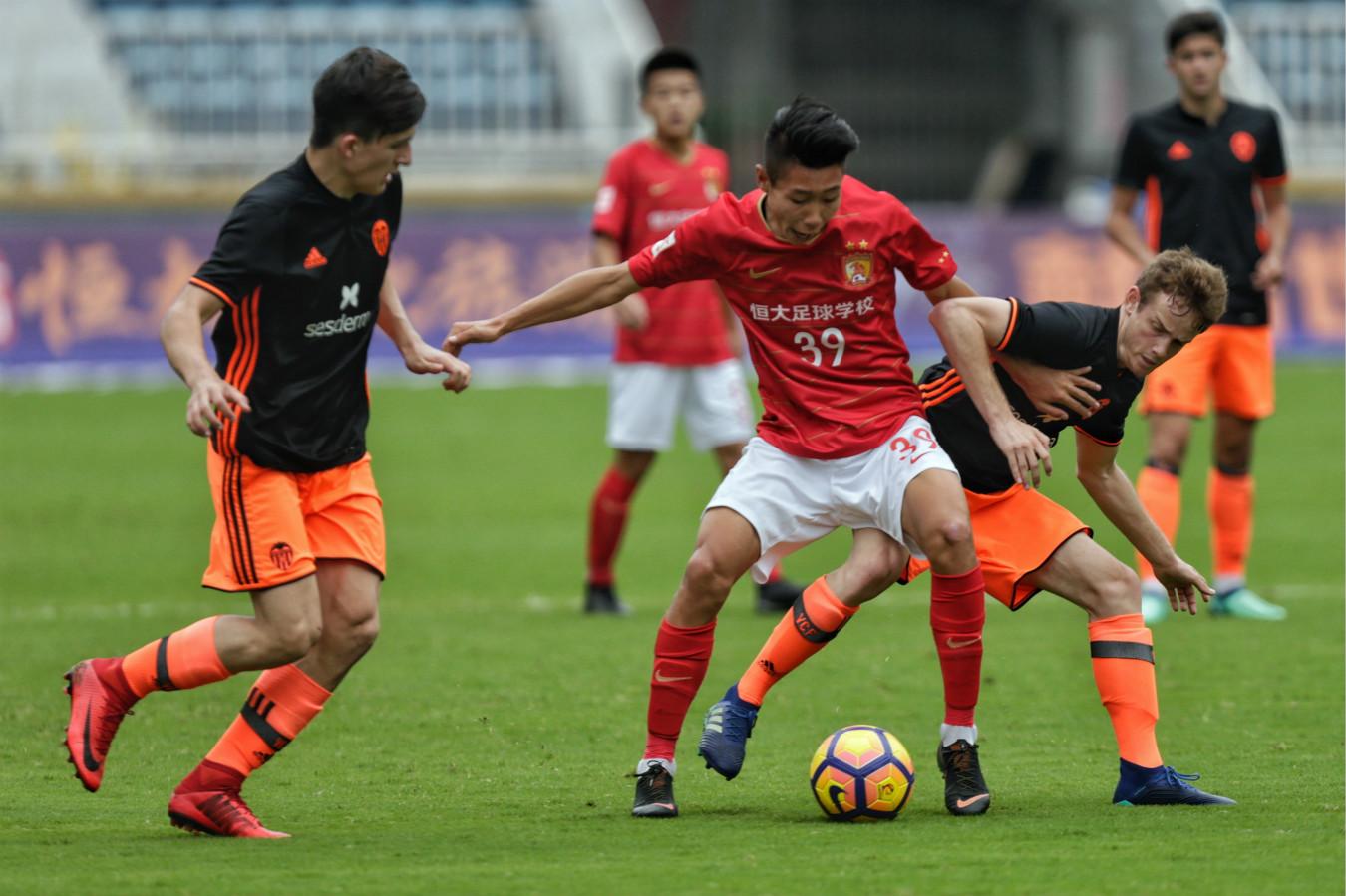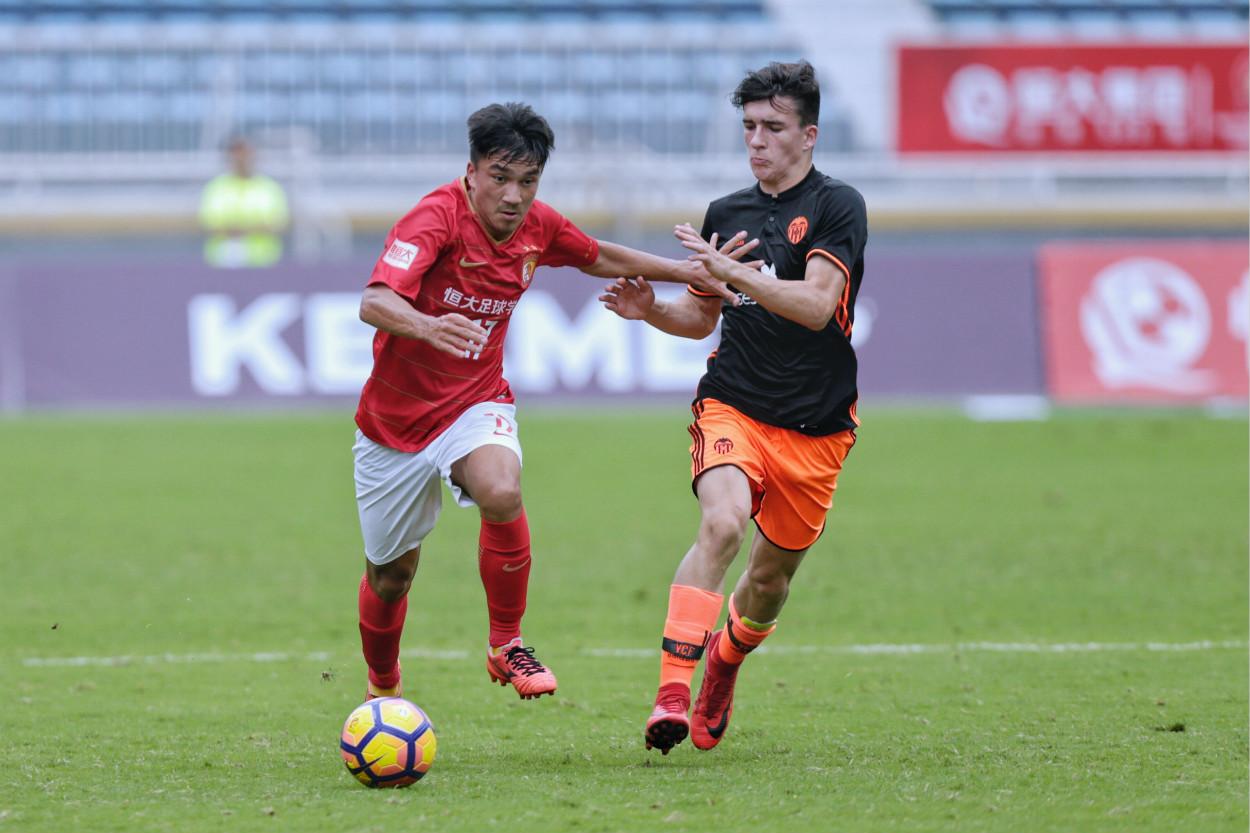 2018年4月24日,“恒大杯”国际足球冠军赛,广州恒大对阵瓦伦西亚,谭凯元在比赛中。