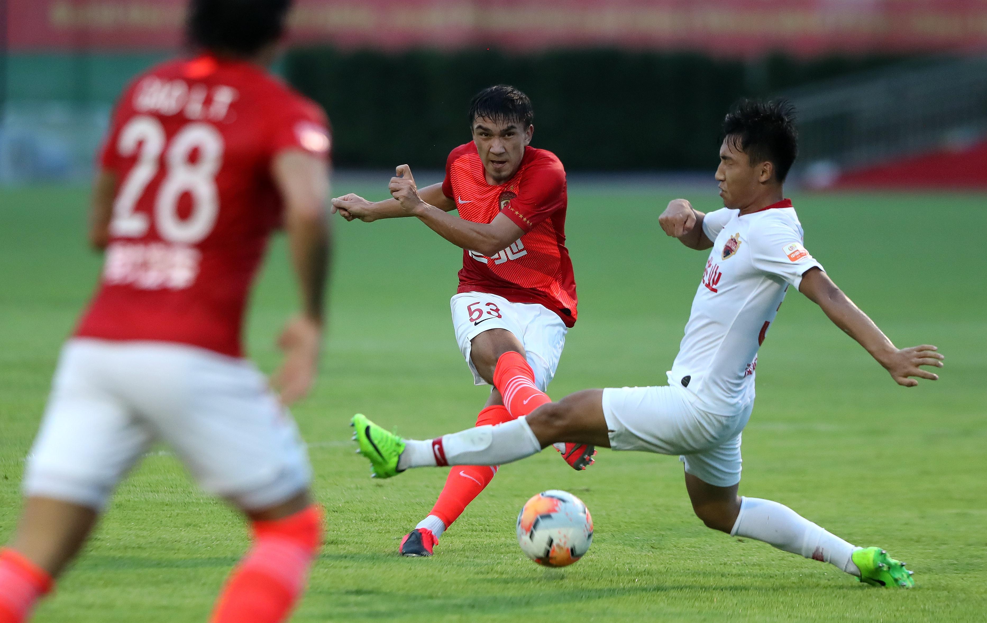 2020年5月9日,帕尔曼江在广州恒大与深圳队的教学比赛中大力射门。
