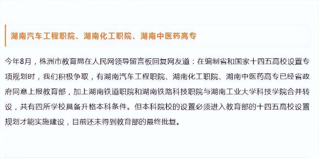 这3所院校分别是湖南汽车工程职院、湖南化工职院和湖南中医药高专,3所院校有望升本科的事情,已经得到了官方的回复,院校在积极争取中。