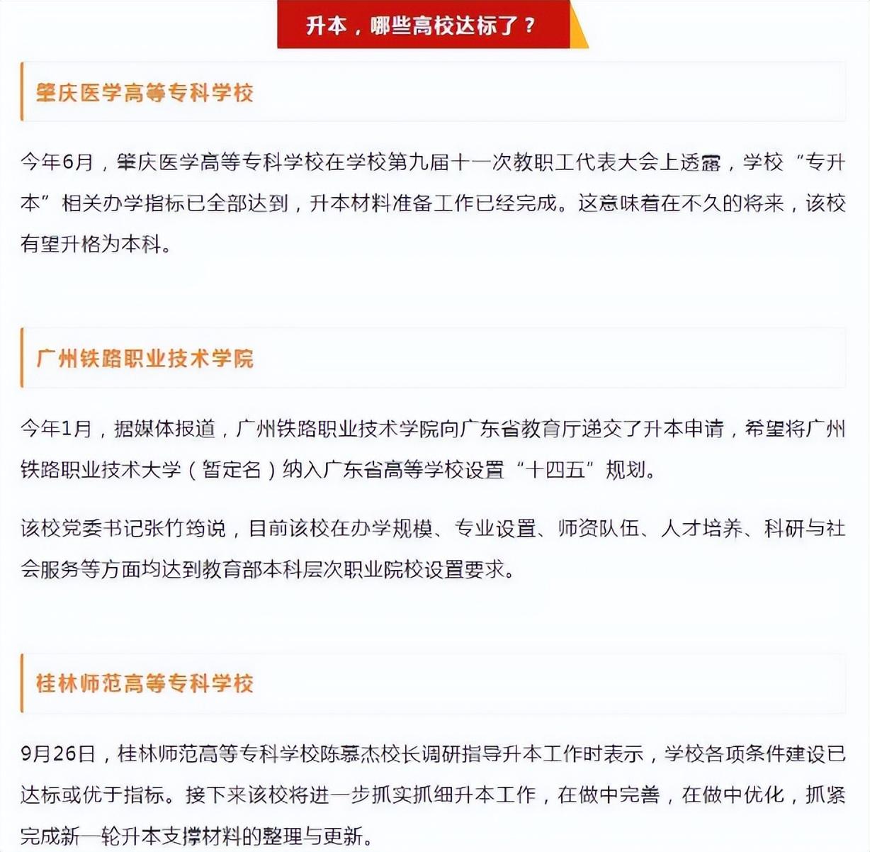 广东省内的肇庆医学高等专科学校也有望升格为本科,这是学习在教职工代表大会上透露的,不少学校的“专升本”相关办学指标已经达到,同时升本材料准备工作也已经完成。