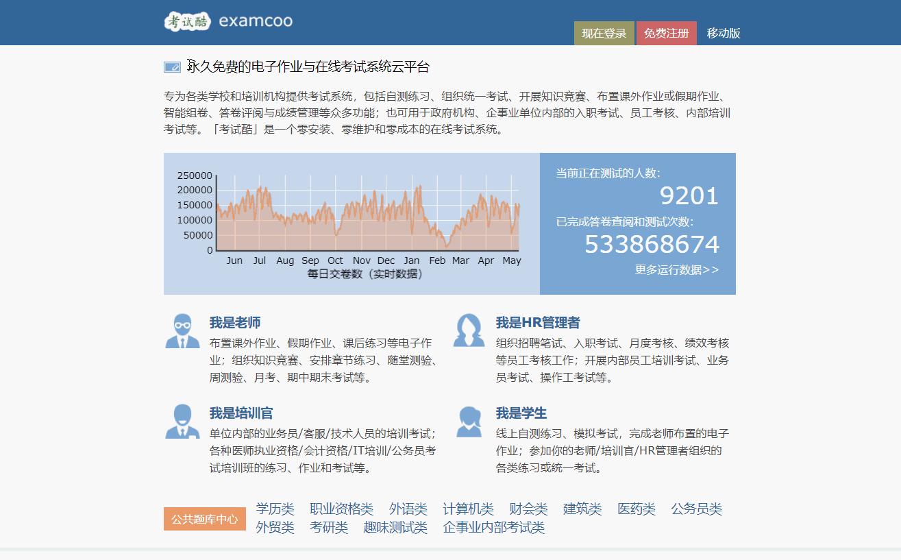 这是一个永久免费的电子作业与在线考试系统平台。尤其是它的公共题库中心,提供了丰富的考试题库,并且这些考试题库全部支持免费查阅和测试。