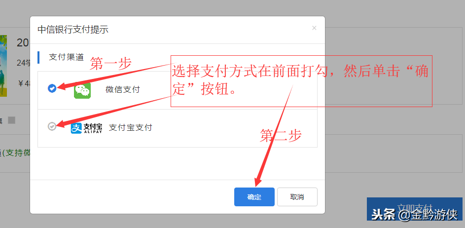 在弹出窗口中选择支付方式,有微信支付和支付宝支付两种支付方式,可以根据自己的情况进行选择,选择好后单击“确定”按钮进入下一步。