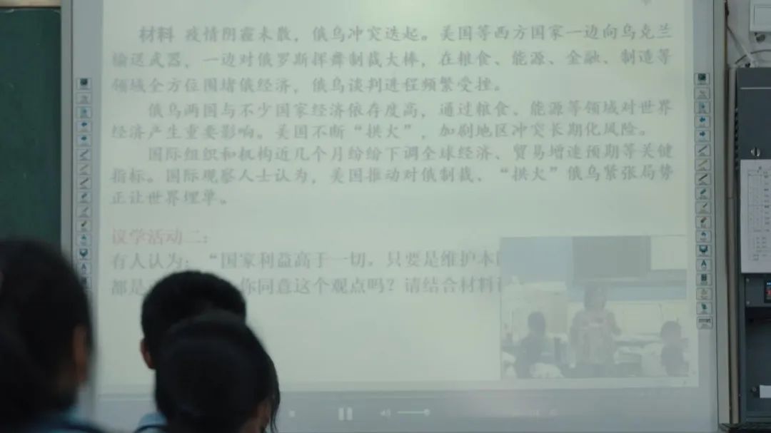 一块屏网课班政治课上,成都七中的老师在讲述国家利益议题时,会分享媒体观点、外交部发言人表态等