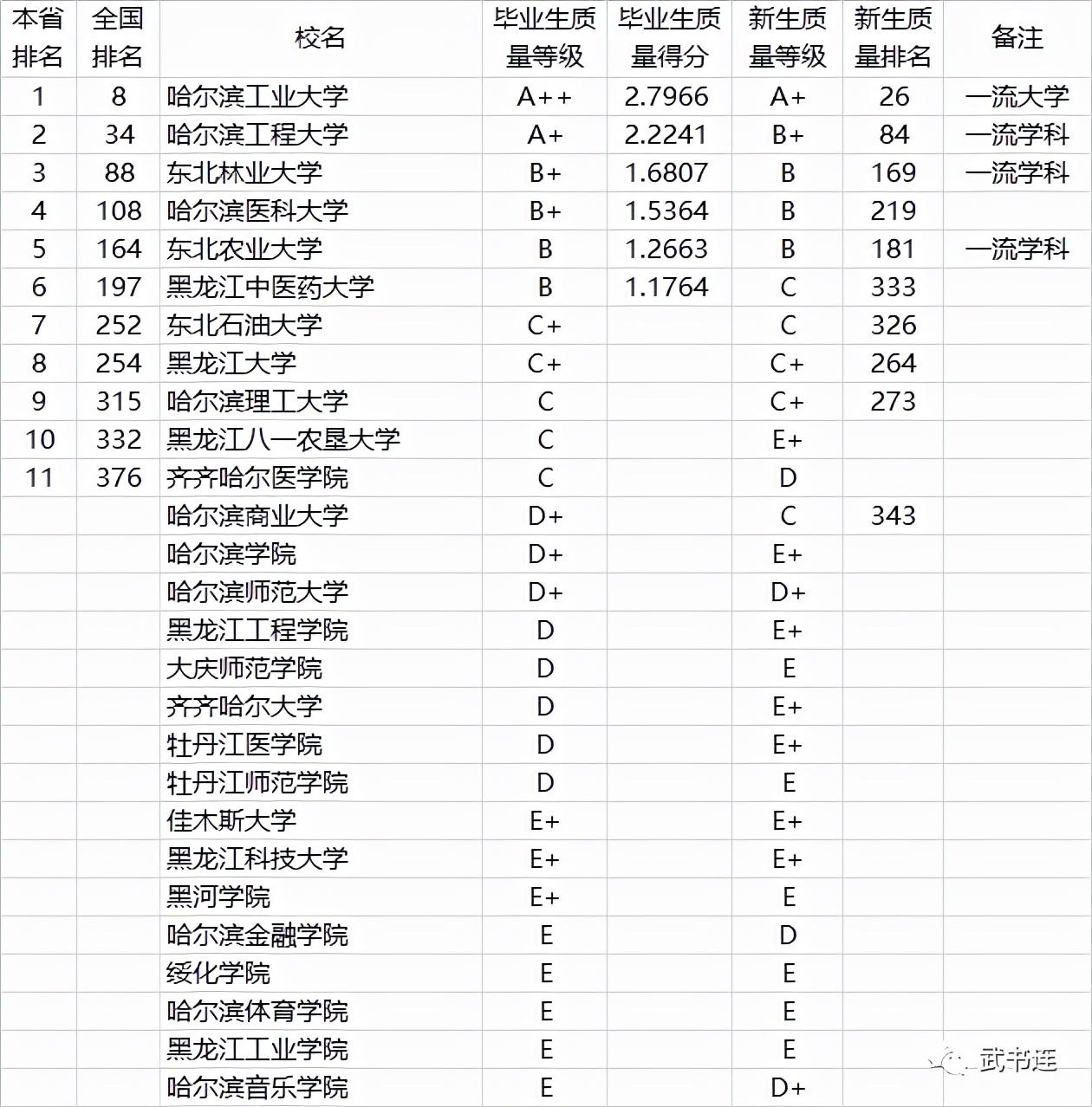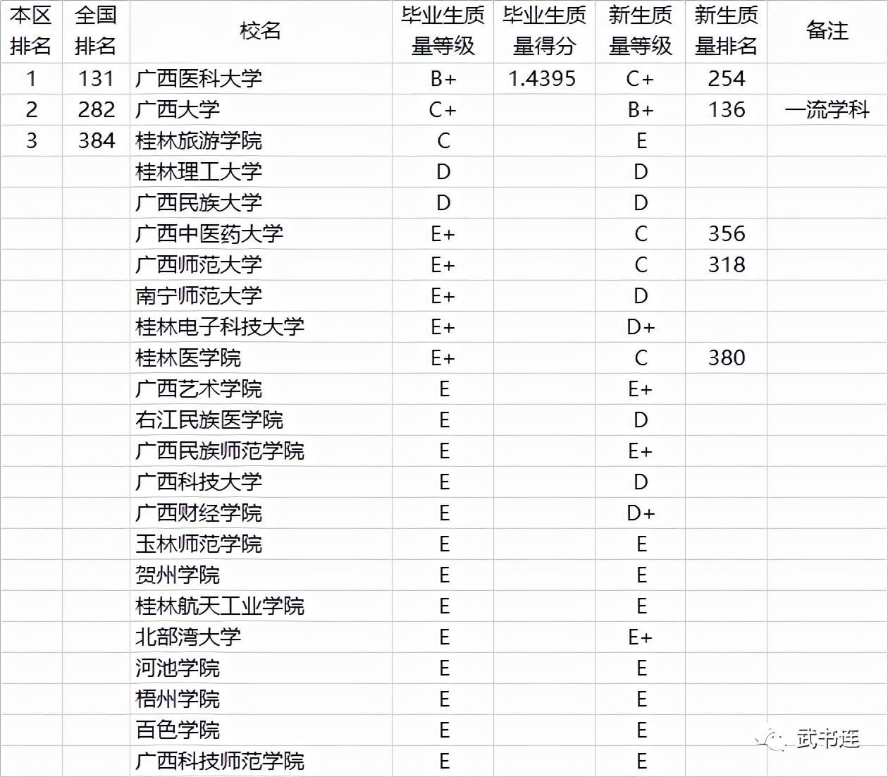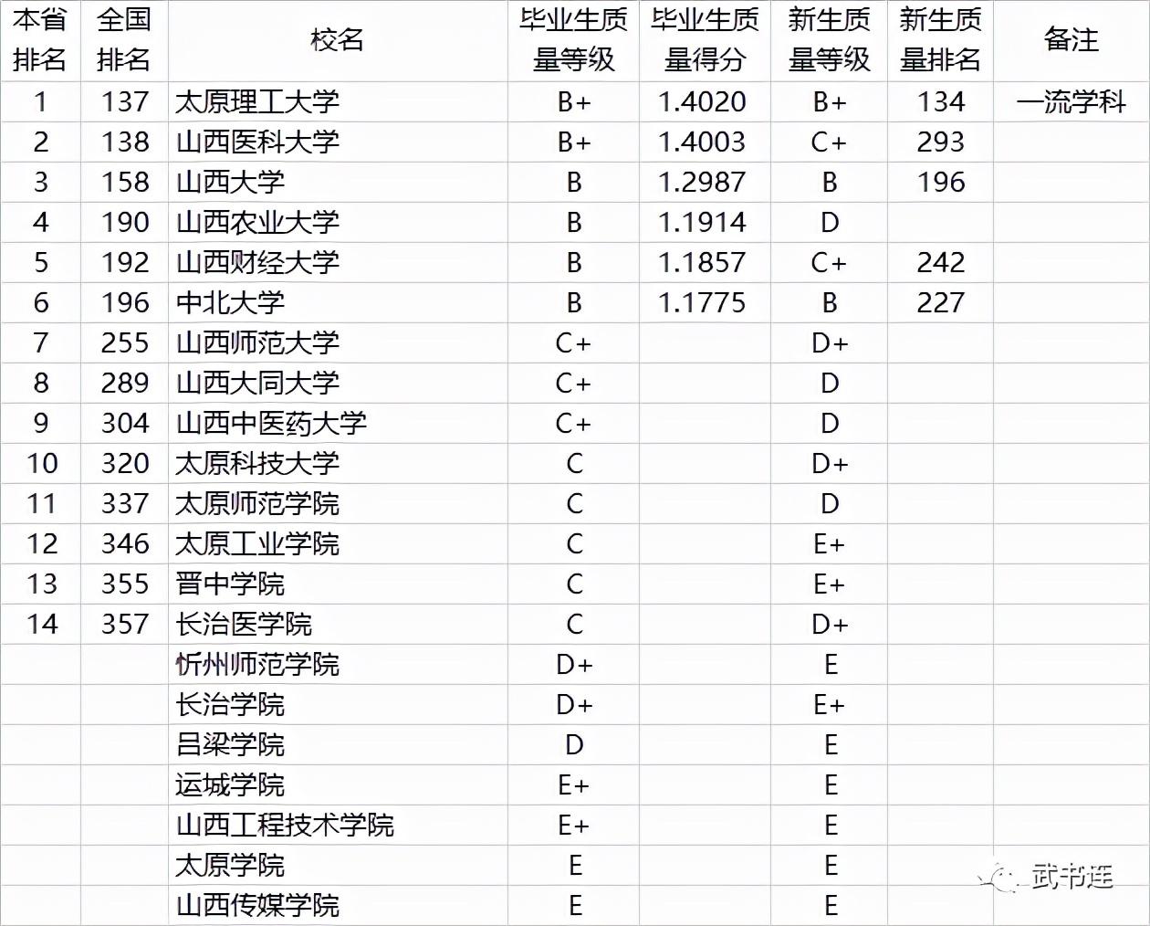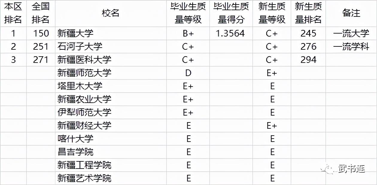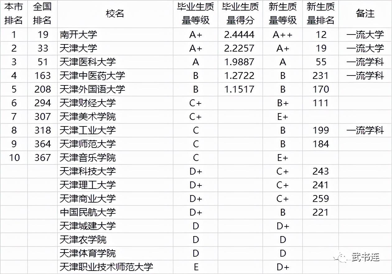 表中毕业生质量、新生质量是C+、C级的,只列排名,不列毕业生质量得分。D+级及以下的,只列等级,不列得分和排名。