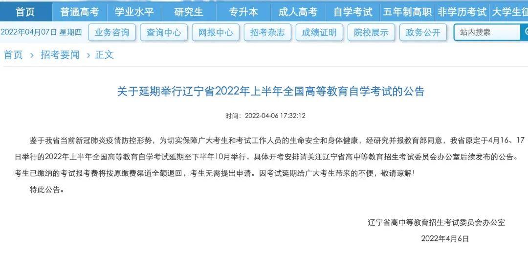 辽宁、天津、山东等地也发布通知,原定于4月16、17日举行的2022年上半年全国高等教育自学考试延期。