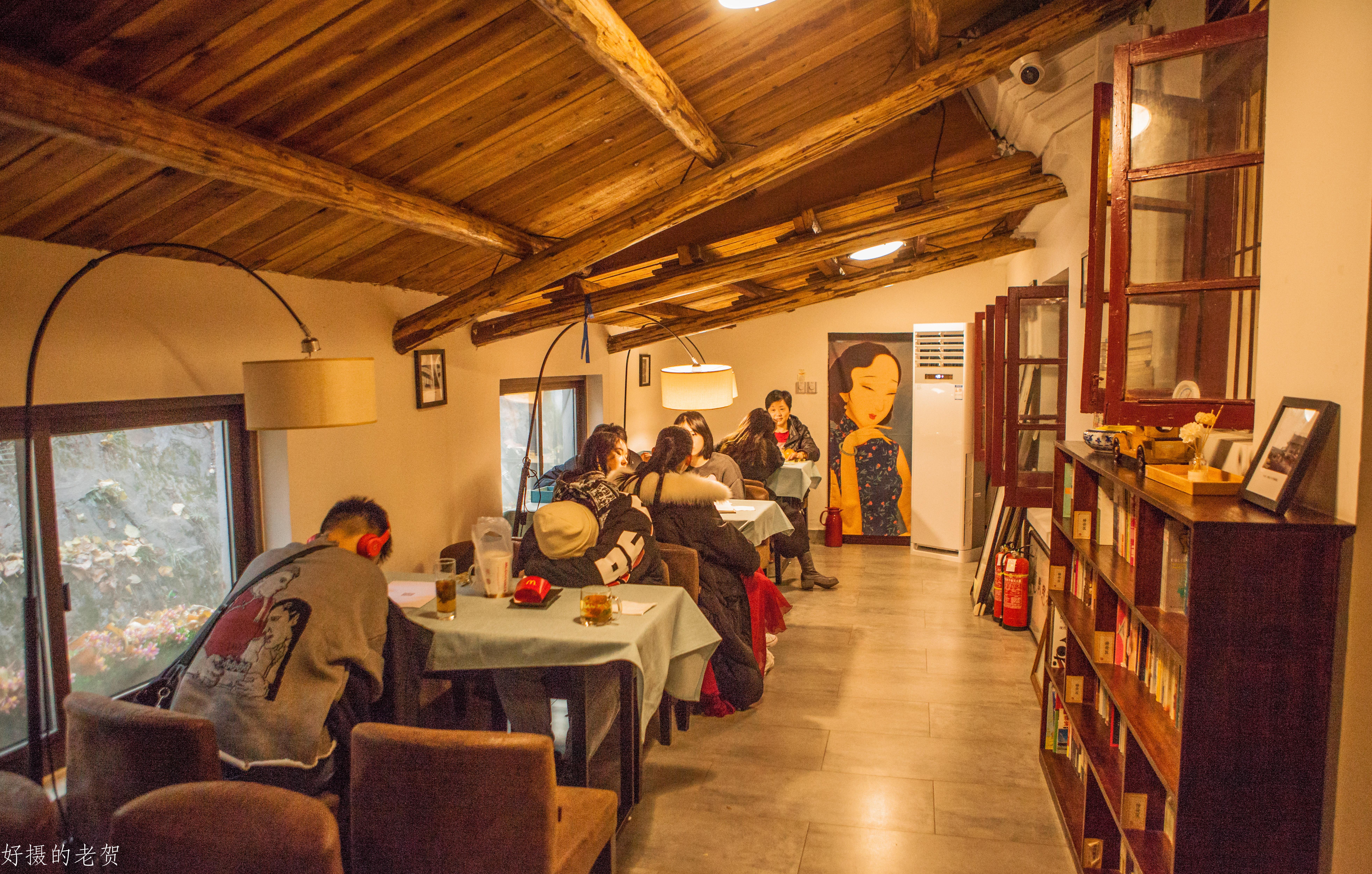 通过一条狭窄的过道进去,后面的阅读空间更有些意思了:窄窄的一条,靠墙是一张张实木的桌子,几个学生在做着作业。视线最远处是一张民国时的时髦女子的招贴画。