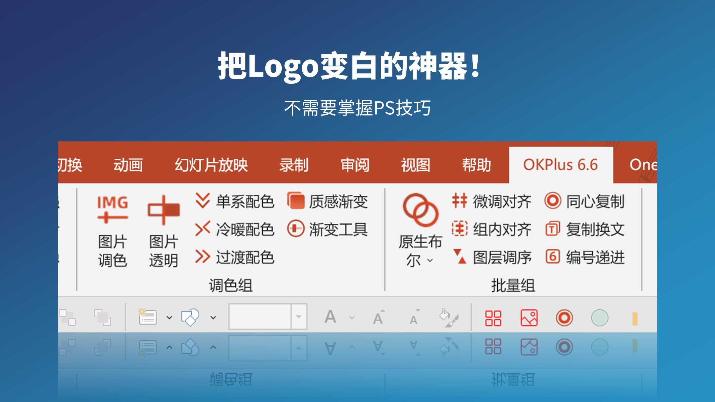 既然Logo的颜色很不统一,那我们就强制将它统一成白色。在深色的PPT背景中,这样是不是更和谐了呢?为了从视觉上更统一,我们也加一个边框。对于浅色的背景,也可以使用白色Logo搭配深色色块。要快速将Logo变为白色,推荐一个PPT插件“OK Plus”,使用“图片调色”功能,导入所选Logo,饱和度拉到最低,亮度拉到最高。再导出到幻灯片。原来的Logo就替换成纯白色啦!