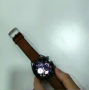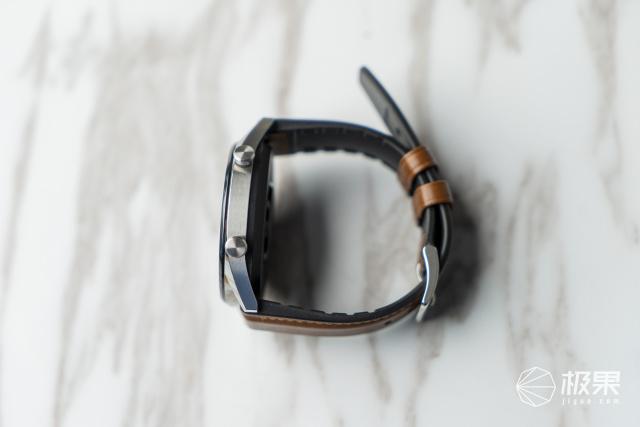 极果君拿到是时尚版的华为 Watch GT,它提供了皮胶混合表带,表面看是优质牛皮材质,而另一面却是橡胶材质。这样的结合不仅拥有皮质的格调与手感,还兼具了硅胶的透气与耐用。