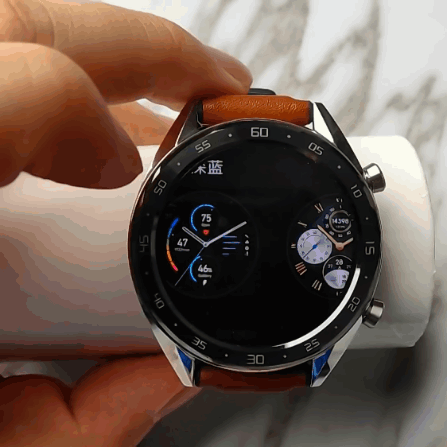 1.39 吋 AMOLED 高清触摸彩屏,分辨率为 454×454,用惯单色小屏幕手环的极果君,着实被这块彩色大屏幕所吸引。通过这块屏幕可以更换多种多样的表盘,轻松更换多种风格。